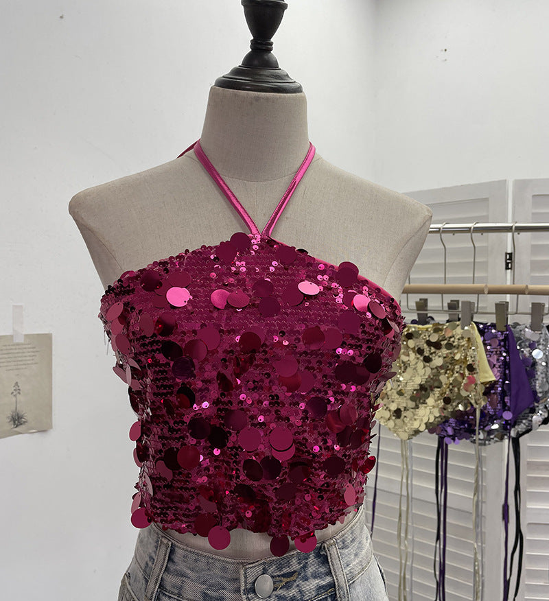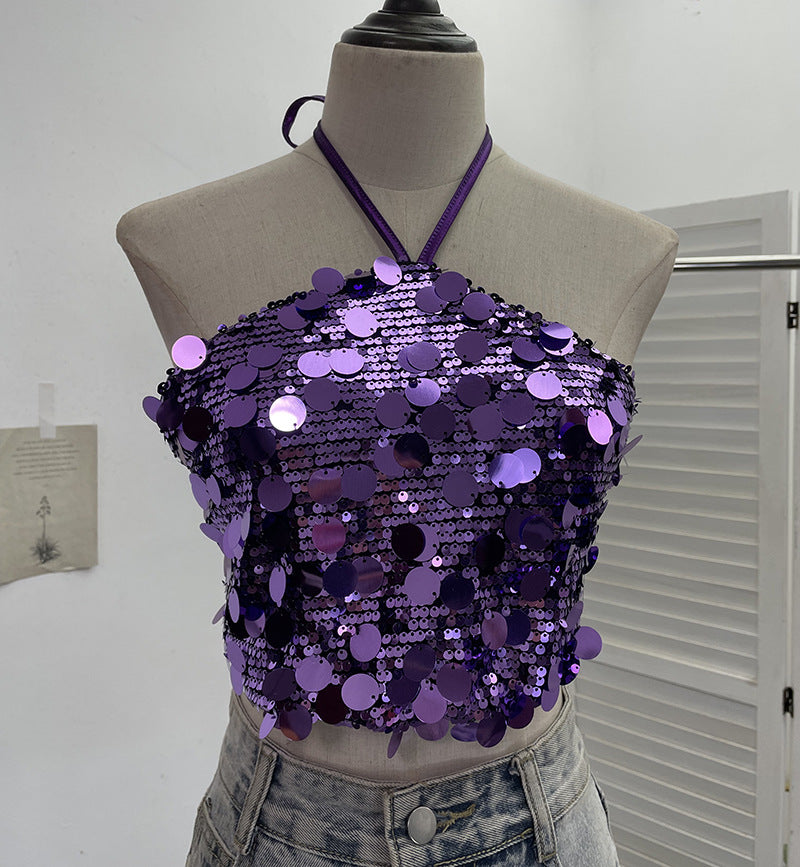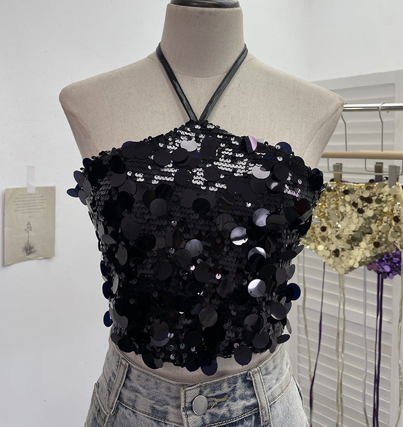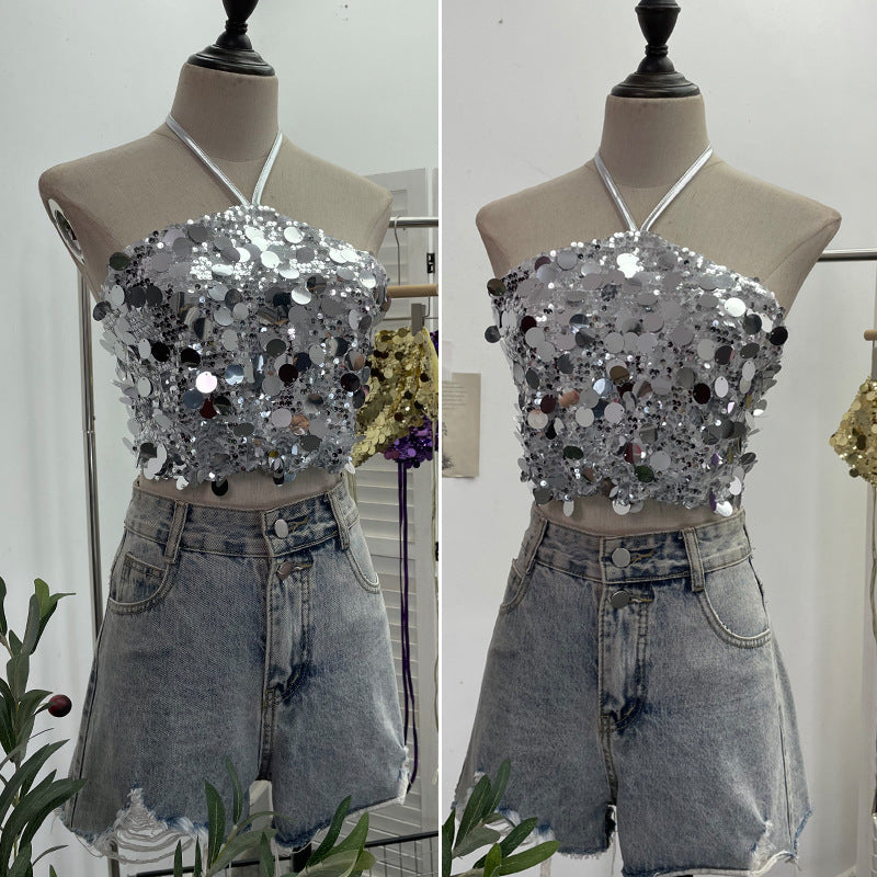Heavy Industry Bling Bling Glide Hanging Neck Sling Vest One-Style Wrapping Tie With Large Bare Back Blouse 1083 HZ1208