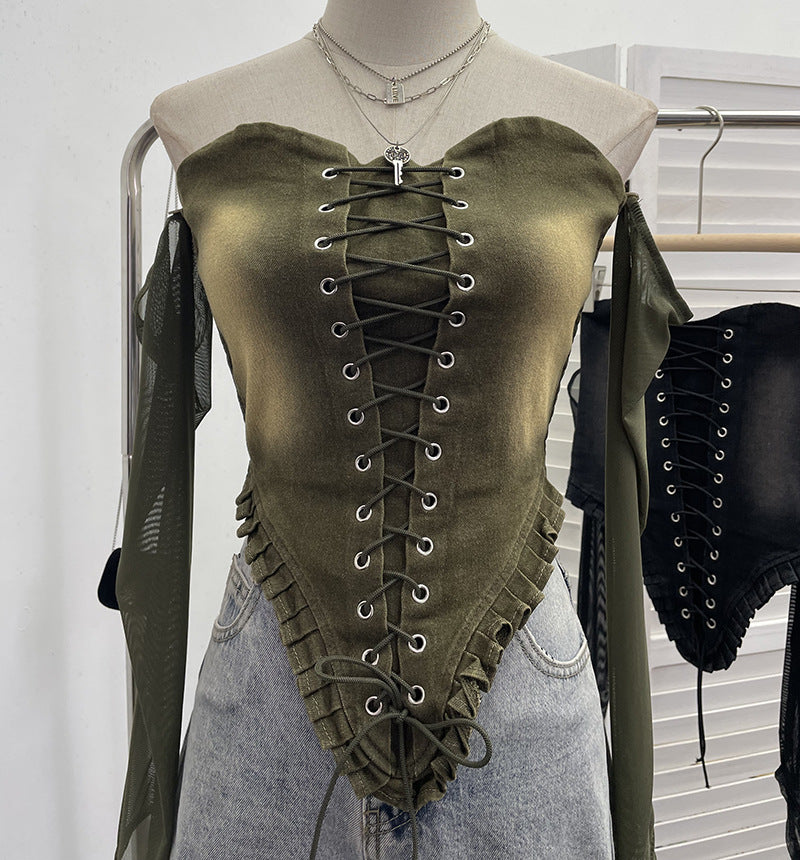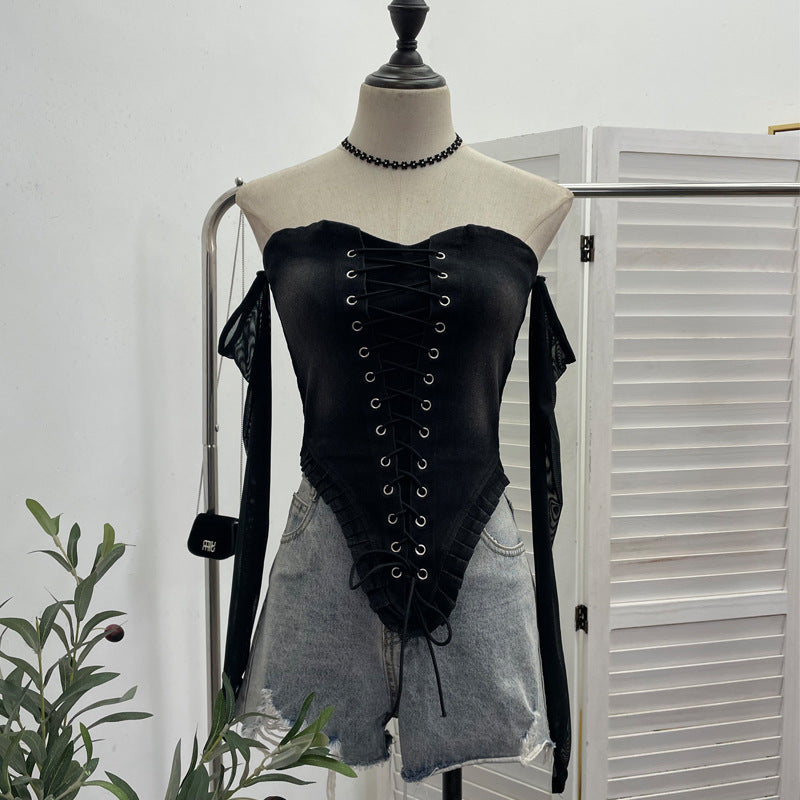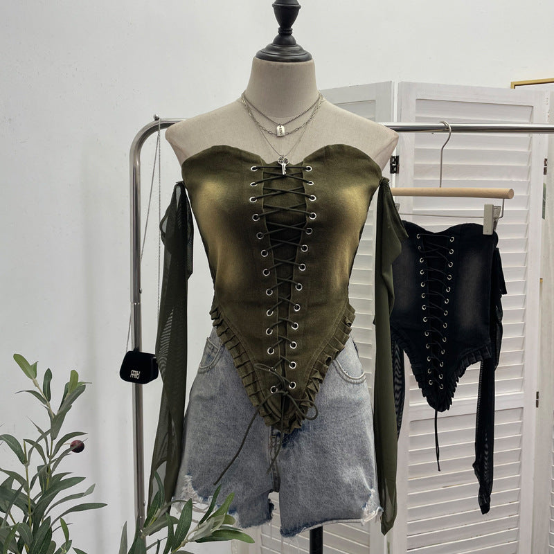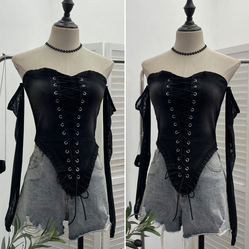 Hottie Sexy Tset Blouse Irregular Cowboy Splicing Mesh Yarn Tie With Short T-Shirt 6105 HZ1208