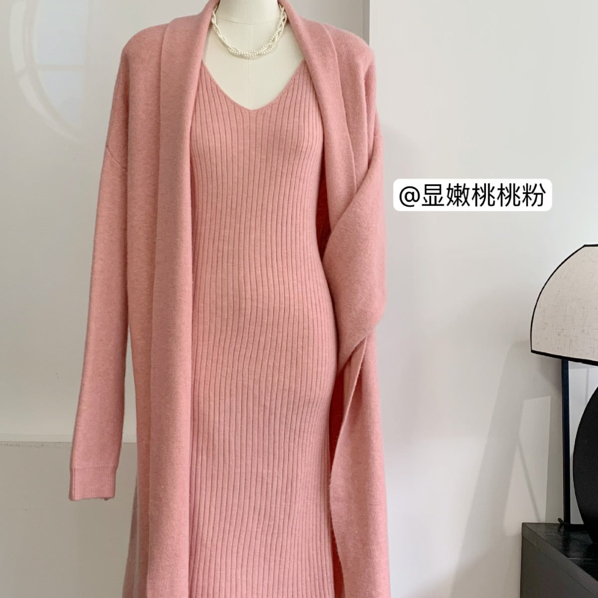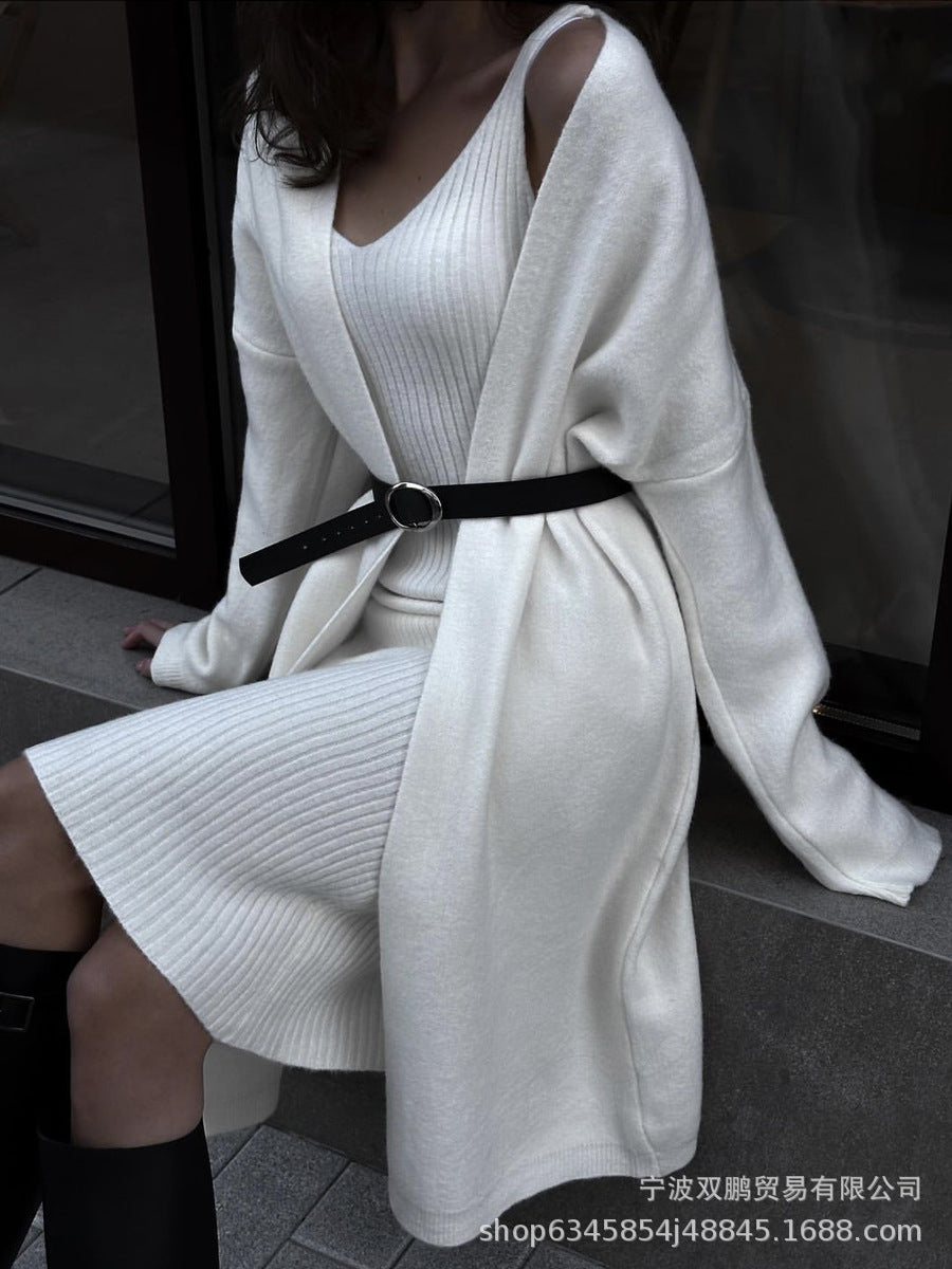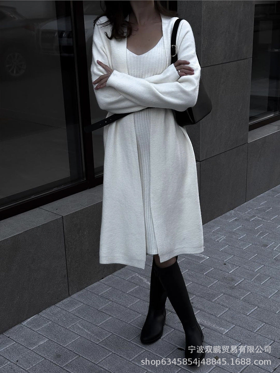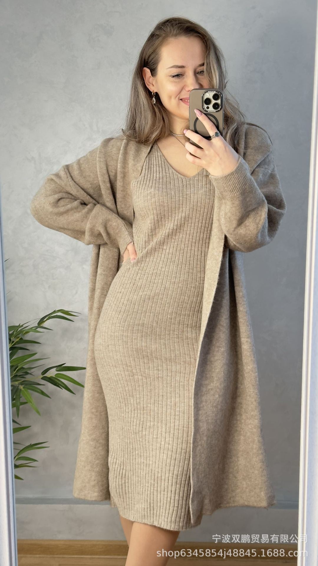 2025 Autumn And Winter Hot Sweater Suit Women Loose Long Version Imitation Cardigan + Open Fork Dress HZ1208