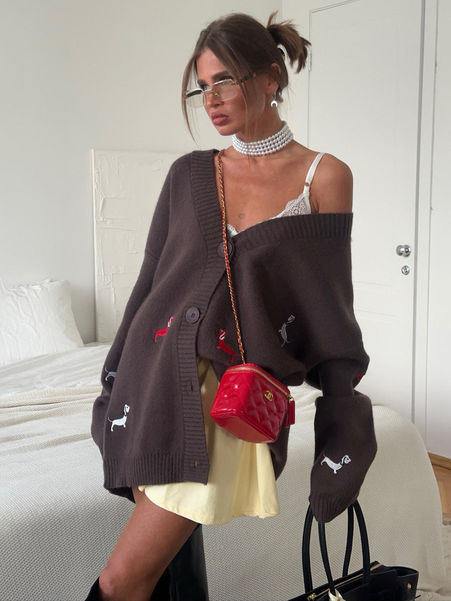 Hottie Wool Single Buckle Dachshund Dachshund Dog Embroidered Sweater Coat Trend Fashion Personality Women's Loose Leisure HZ1208