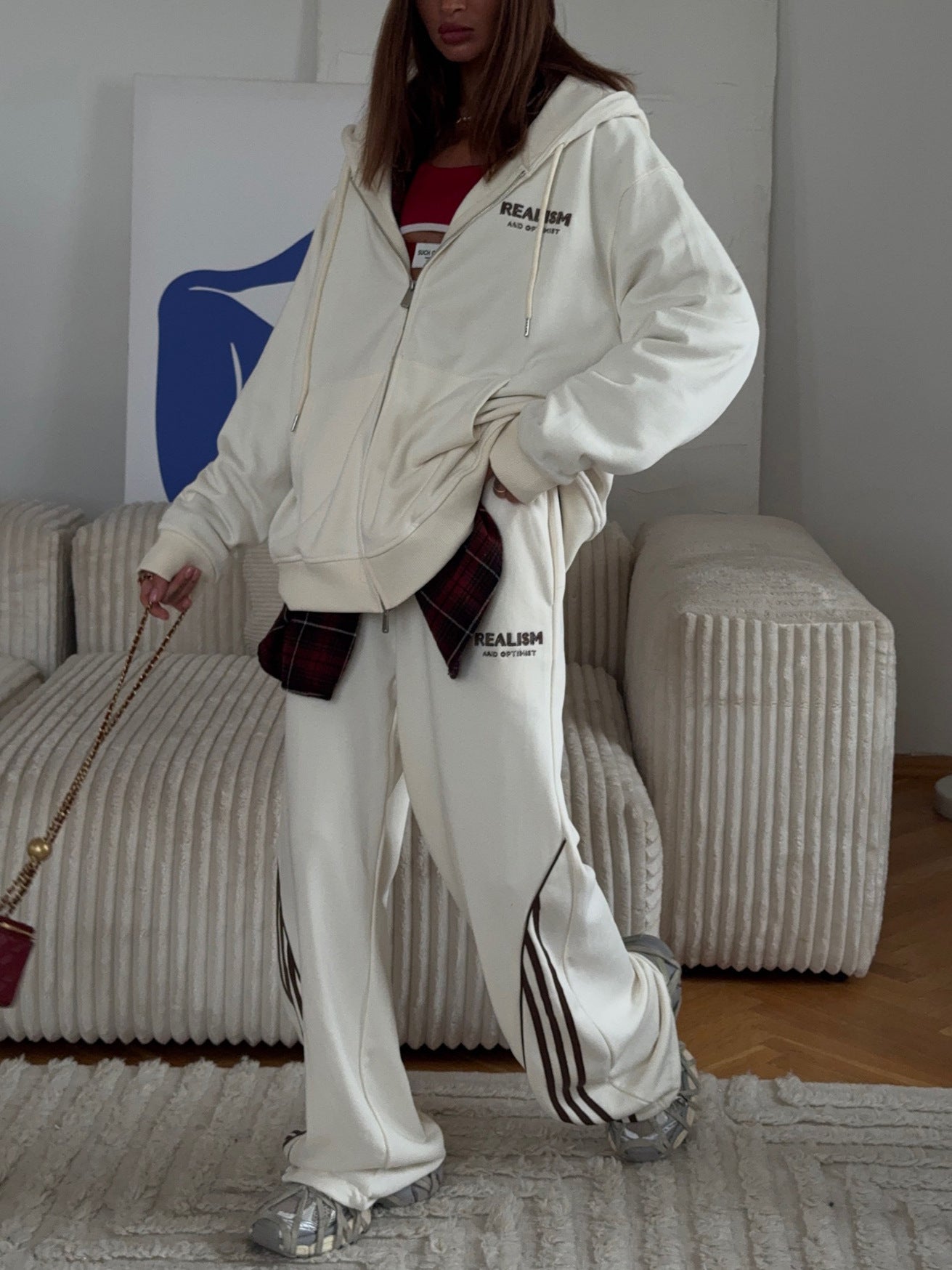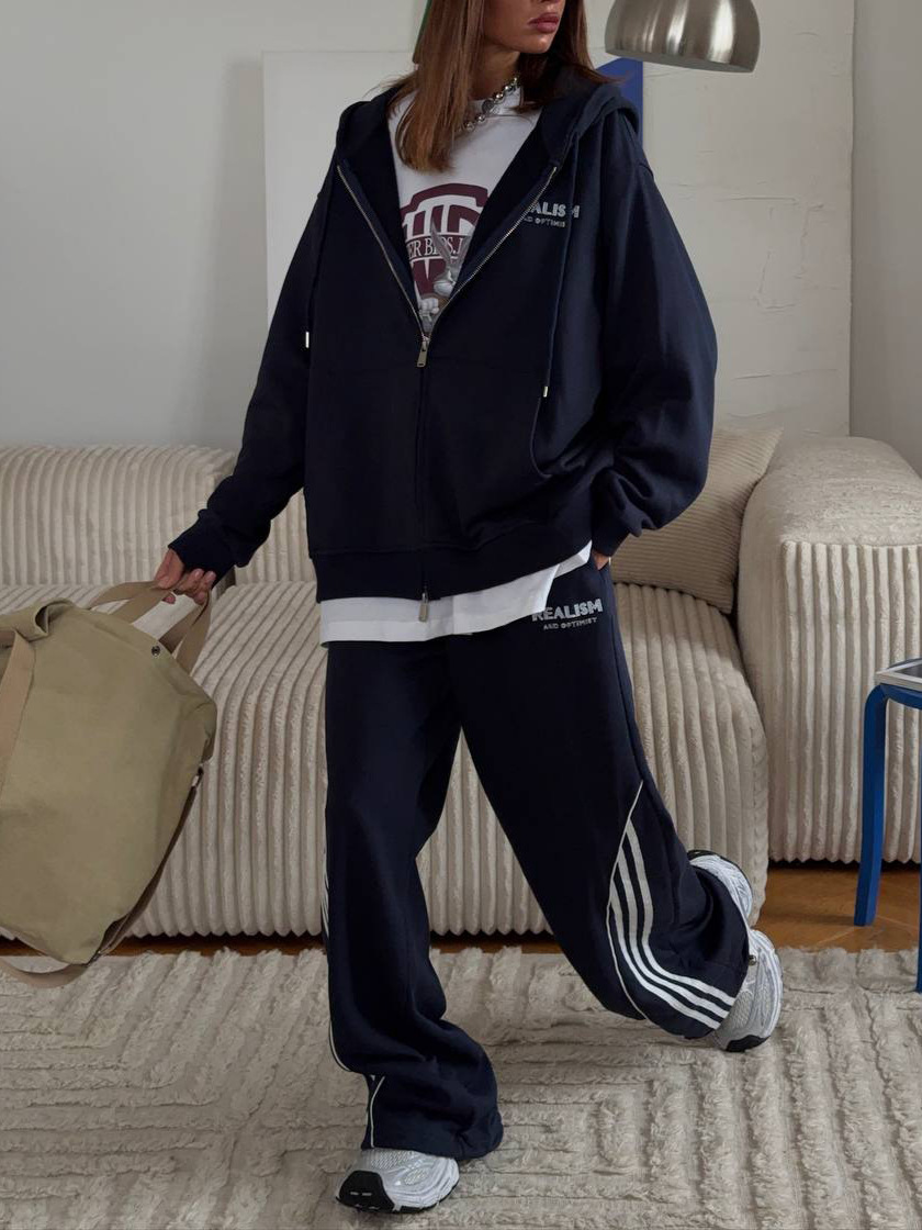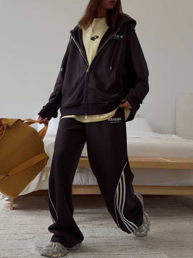 Korean Back Letter-Print Hooded Jacket Suit Women Loose Leisure Relaxation Atmosphere Sense Sports Style Two Sets HZ1208