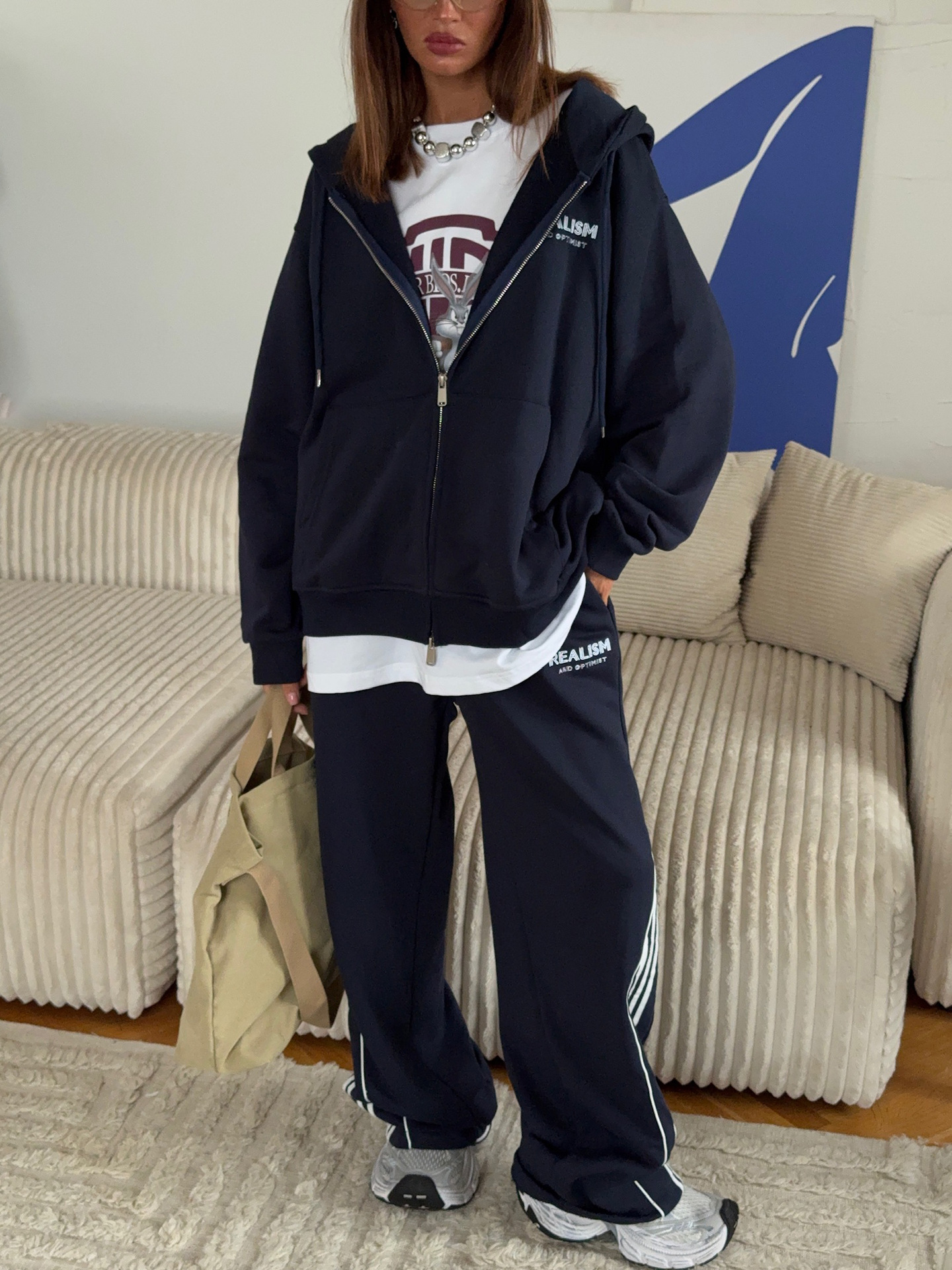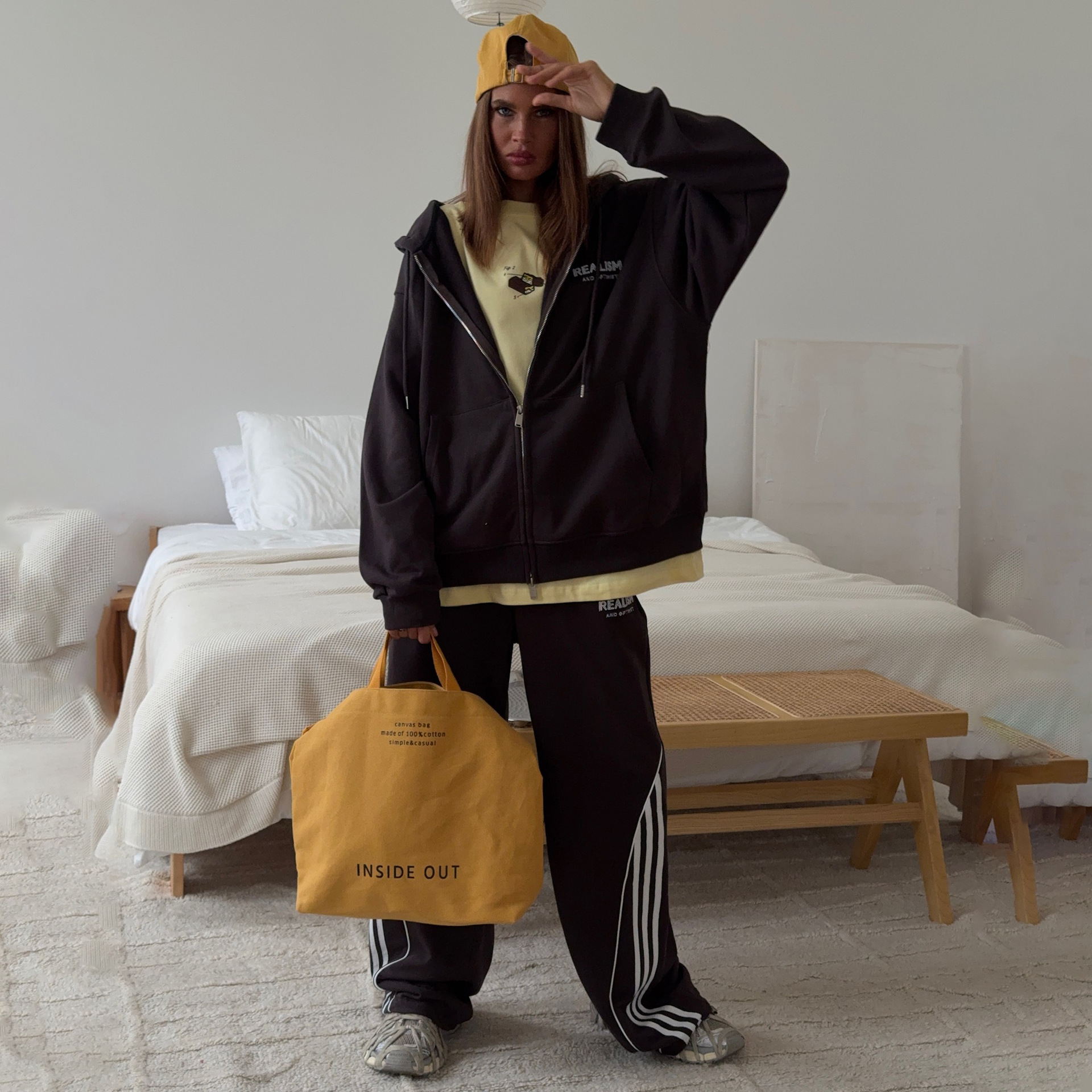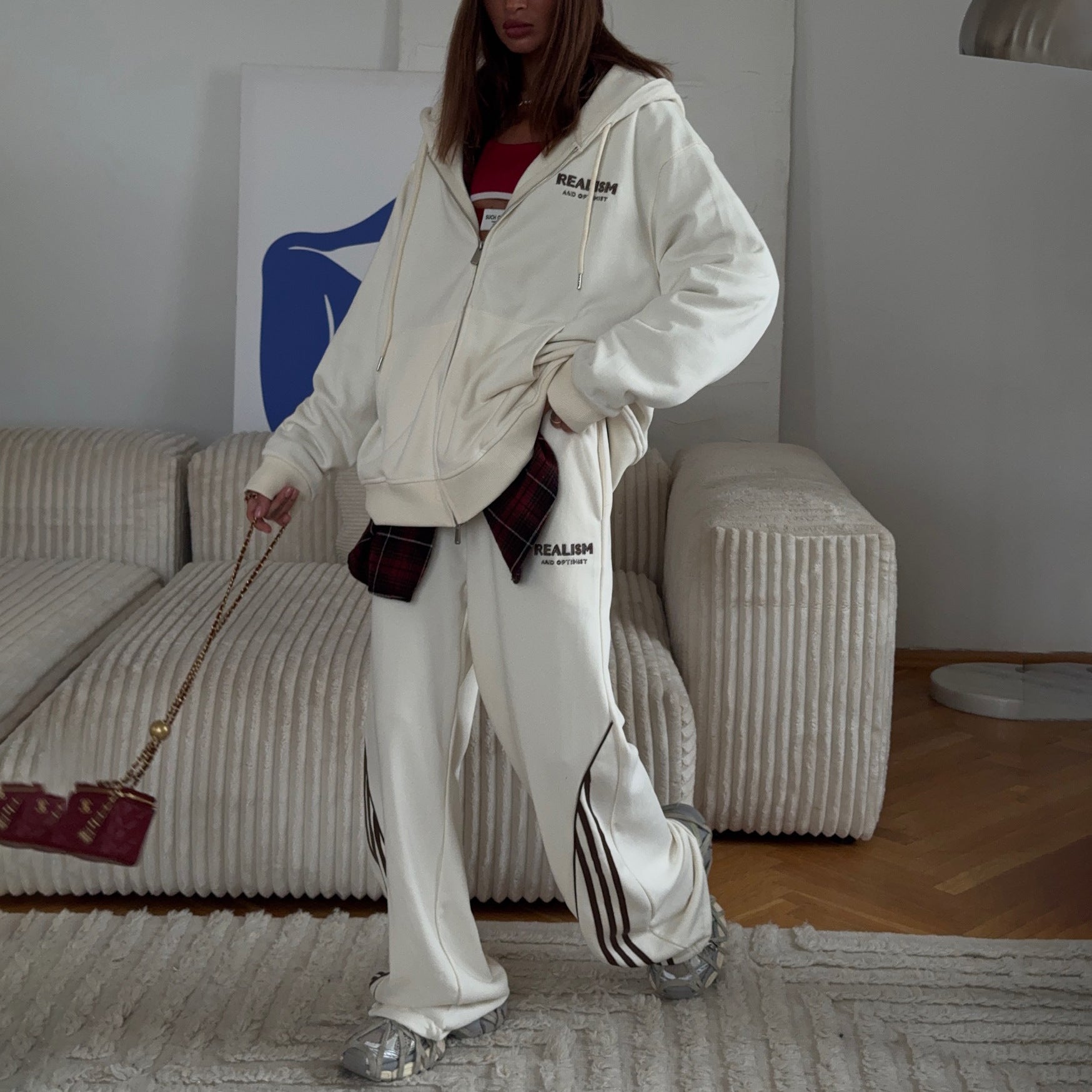 Korean Back Letter-Print Hooded Jacket Suit Women Loose Leisure Relaxation Atmosphere Sense Sports Style Two Sets HZ1208