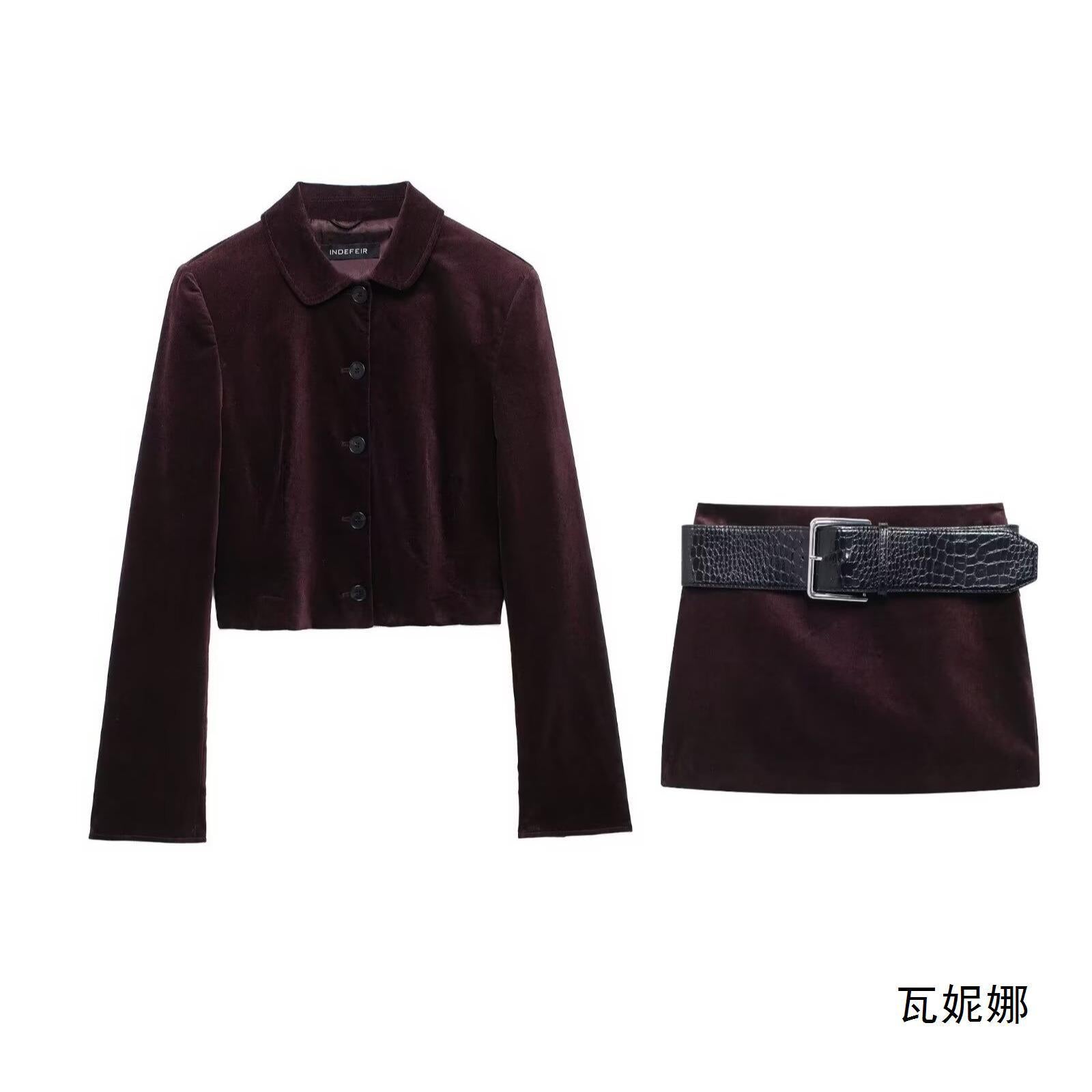 Autumn New Velvet Short Jacket With Belt Miniskirt HZ1208