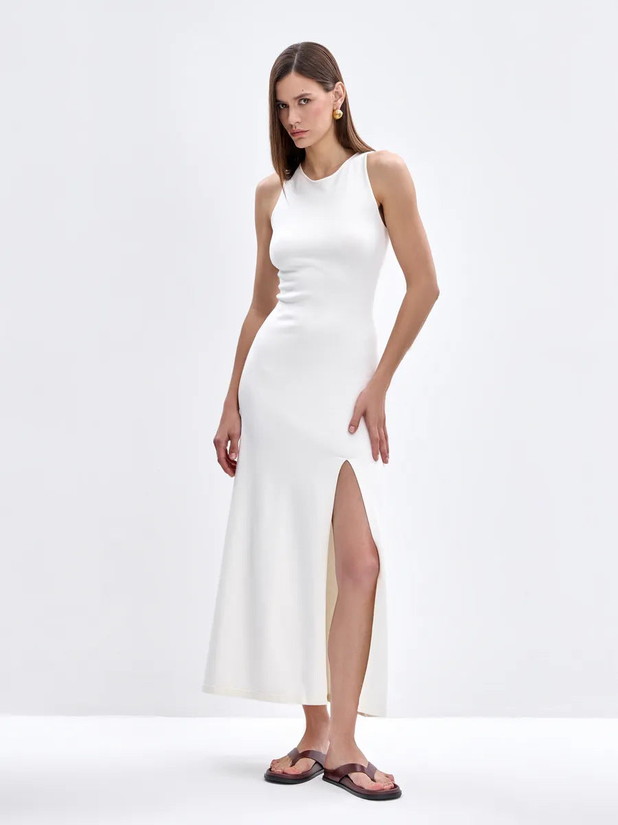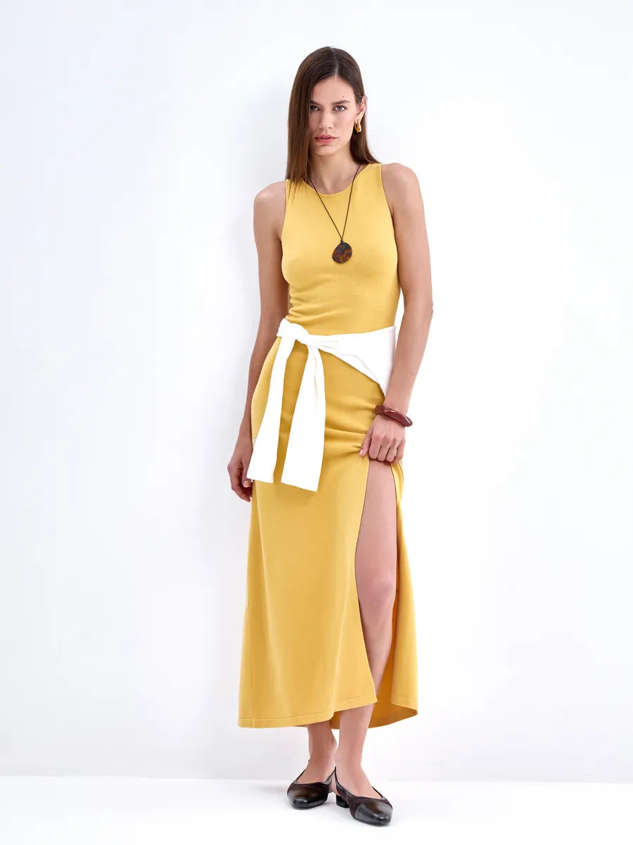 2025 Summer Women's New Hollow Open Waist Design Hanging Neck Knitted Tuxedry Dress Romantic Sweet Wind HZ1208