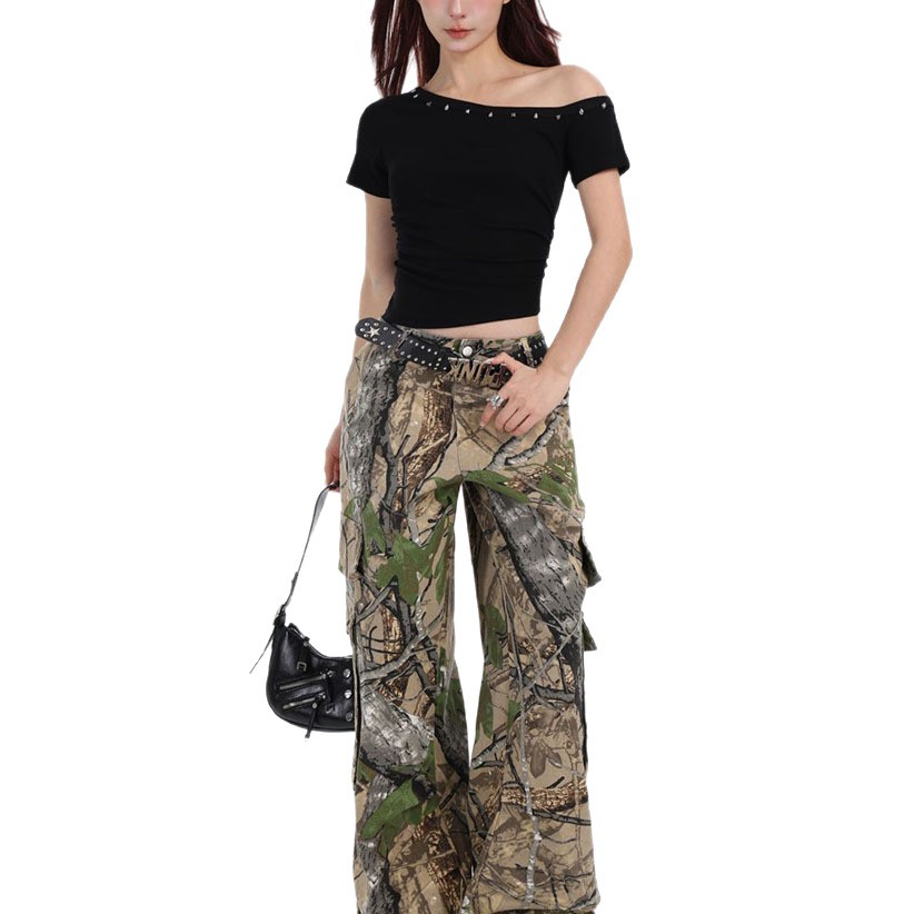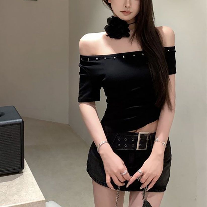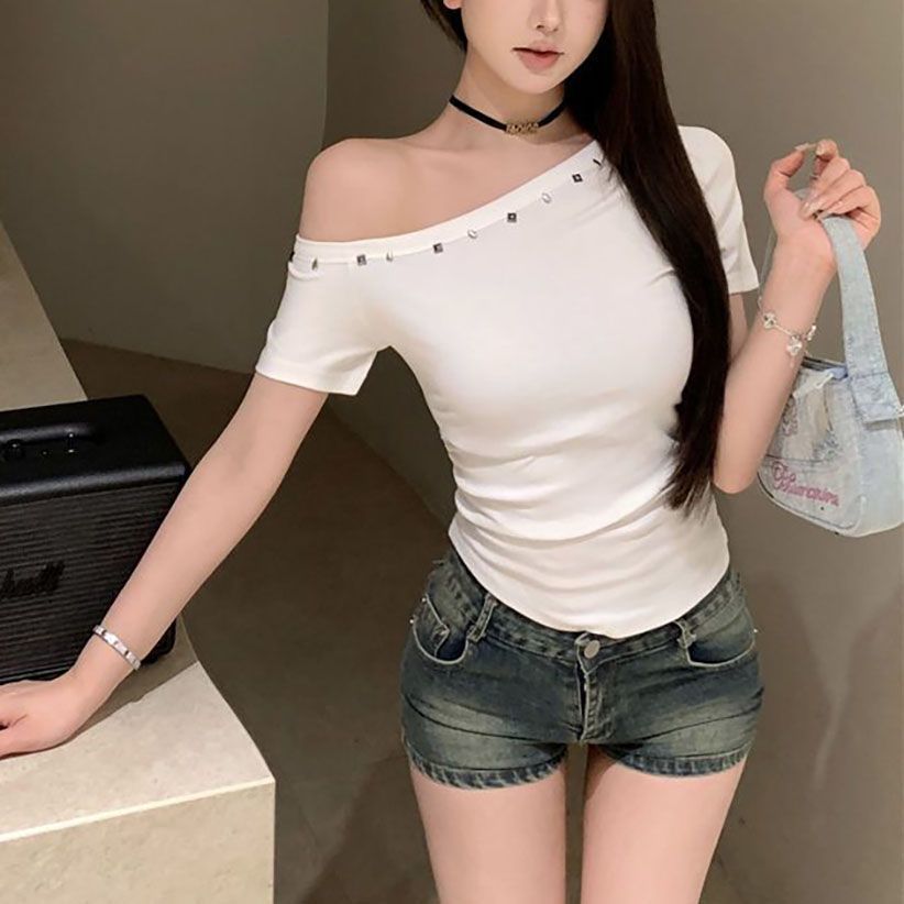 2025 New Black Korean Version Of Irregular Slanted Shoulder Short-Sleeved T-Shirt Girls Summer Design Feel Hottie Repair Body HZ1208