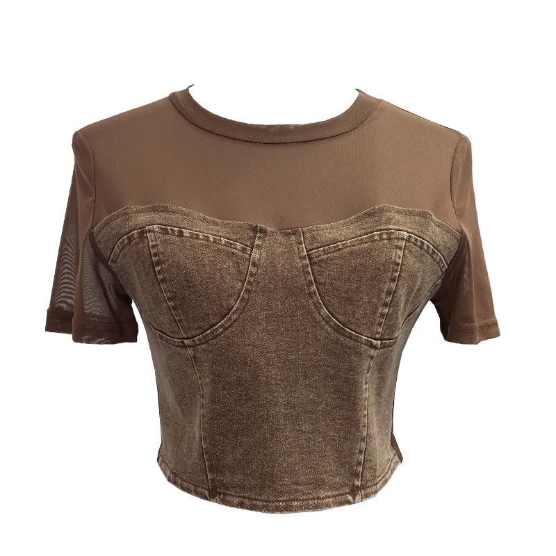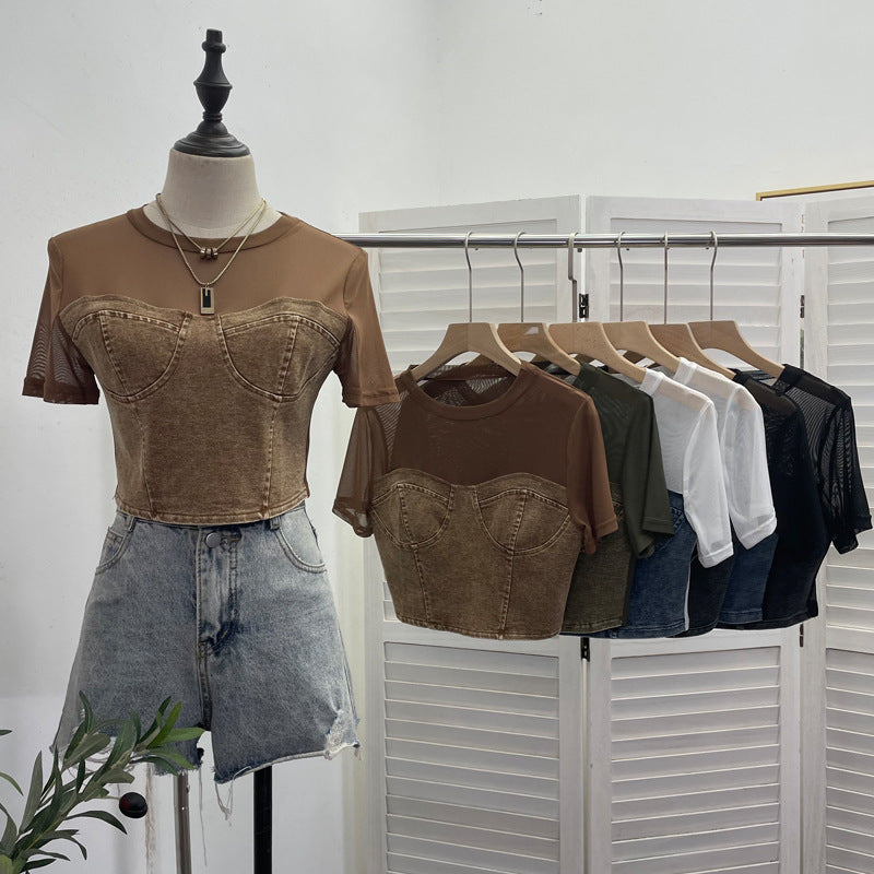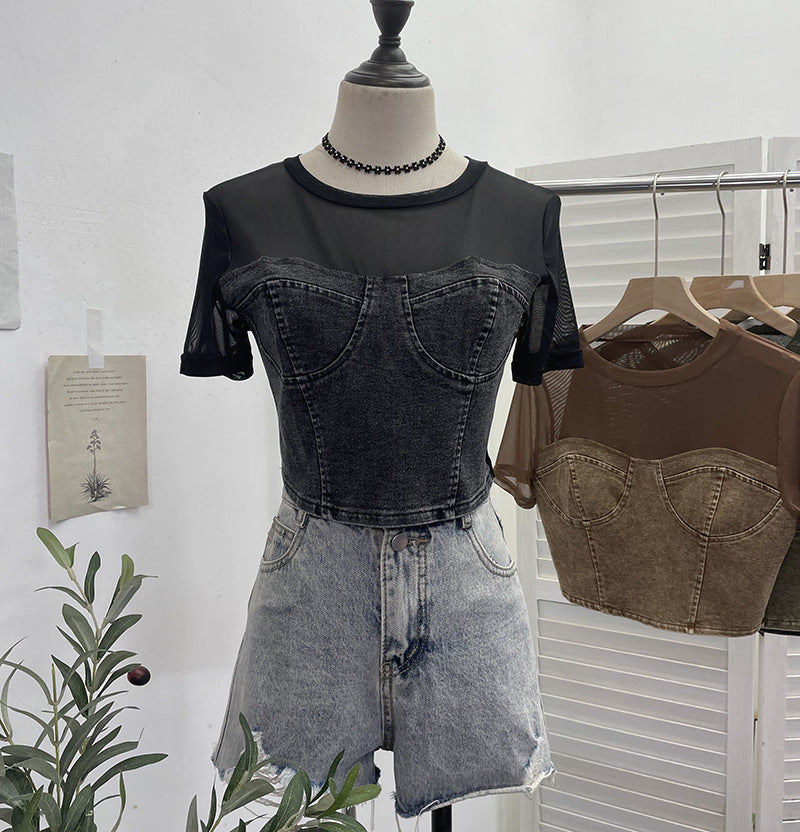 2025 Summer Denim Splicing Mesh Yarn Short-Sleeved T-Shirt Design Fake Two Hot Girl Short Top 26231 HZ1208