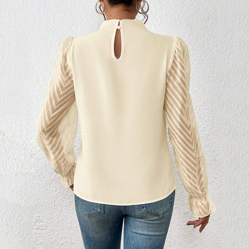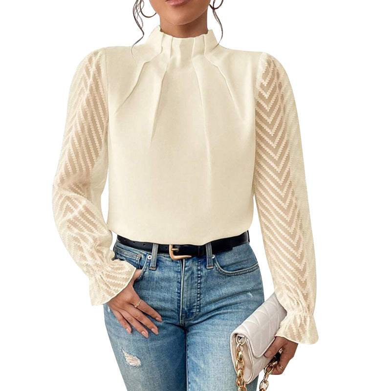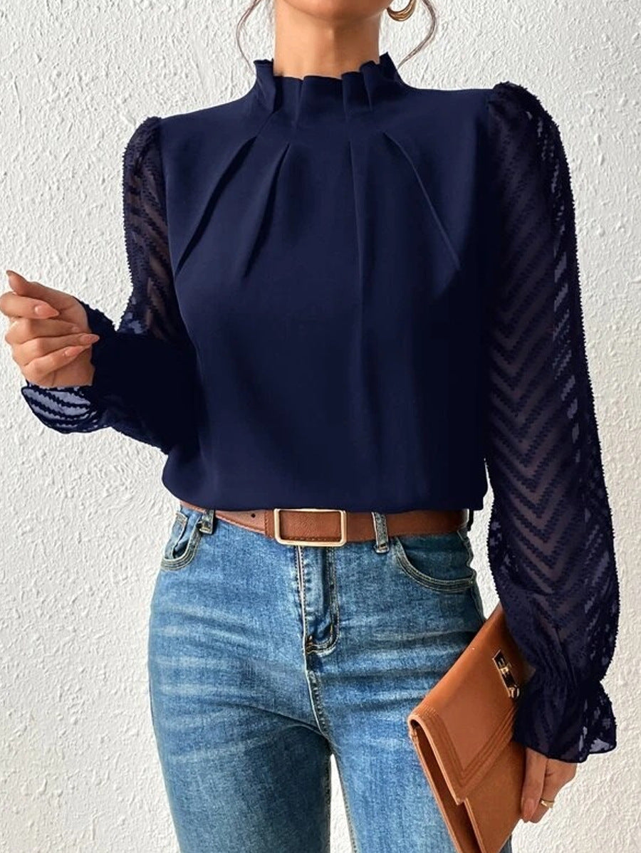 2025 Women's Autumn And Winter New Half-High Collar Spliced Wave Chiffon Long-Sleeved Top Woman HZ1208