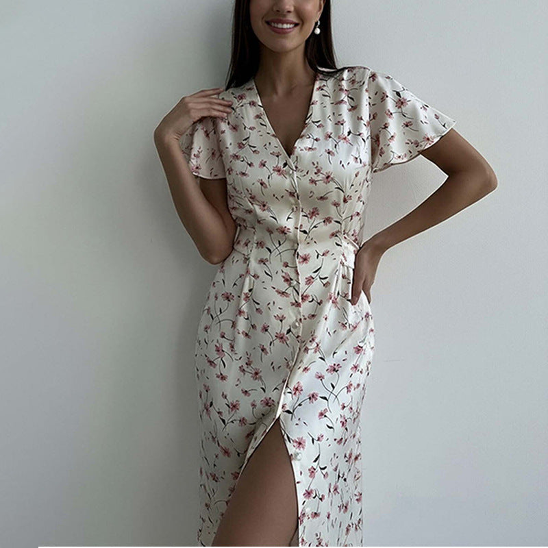 2025 Women's Fashion Print Long-Sleeved V-Neck Bag-Groomed Commuting Dress 661 HZ1208