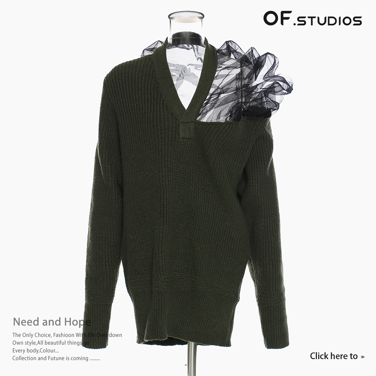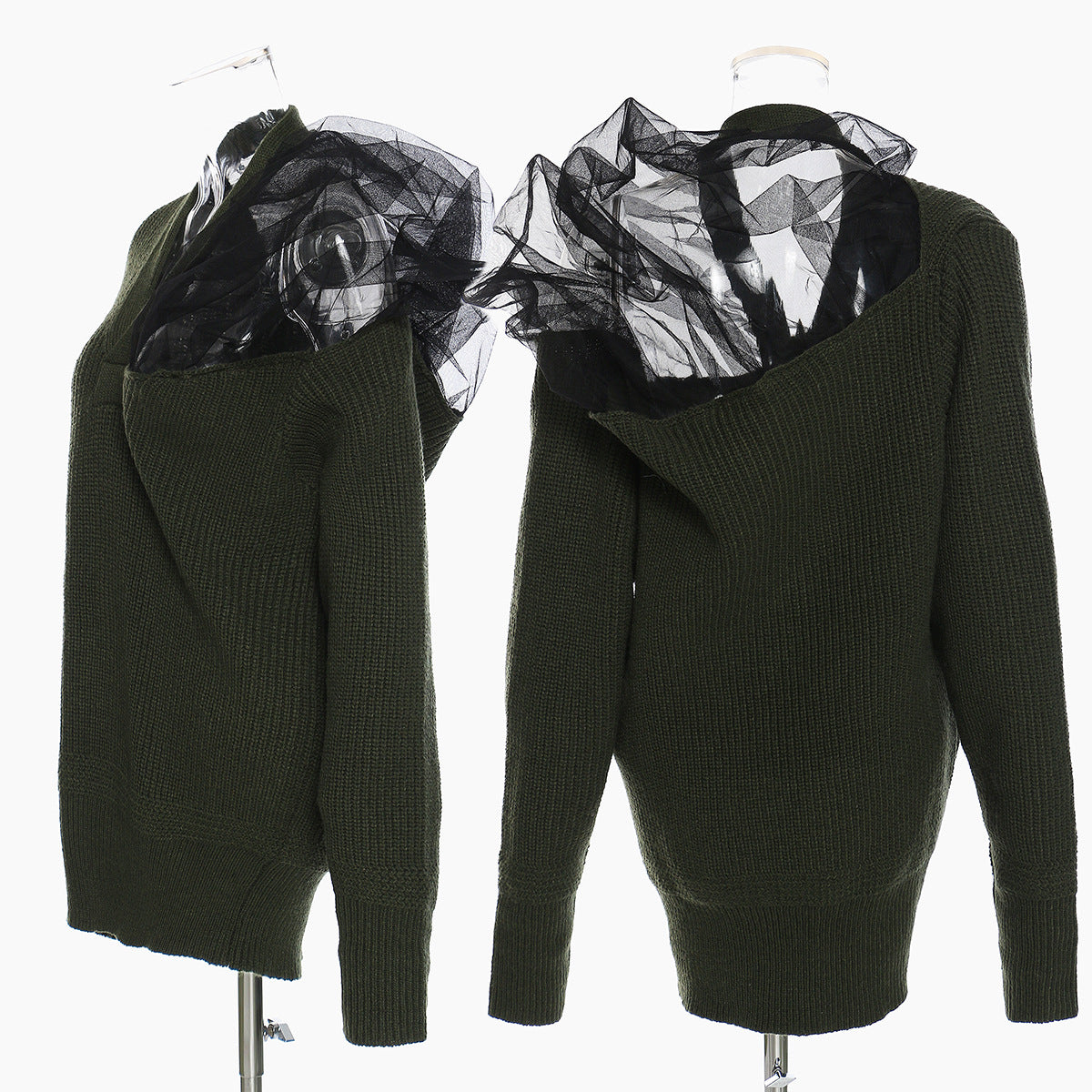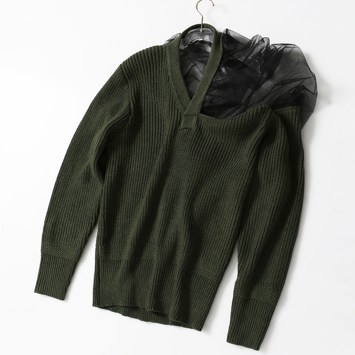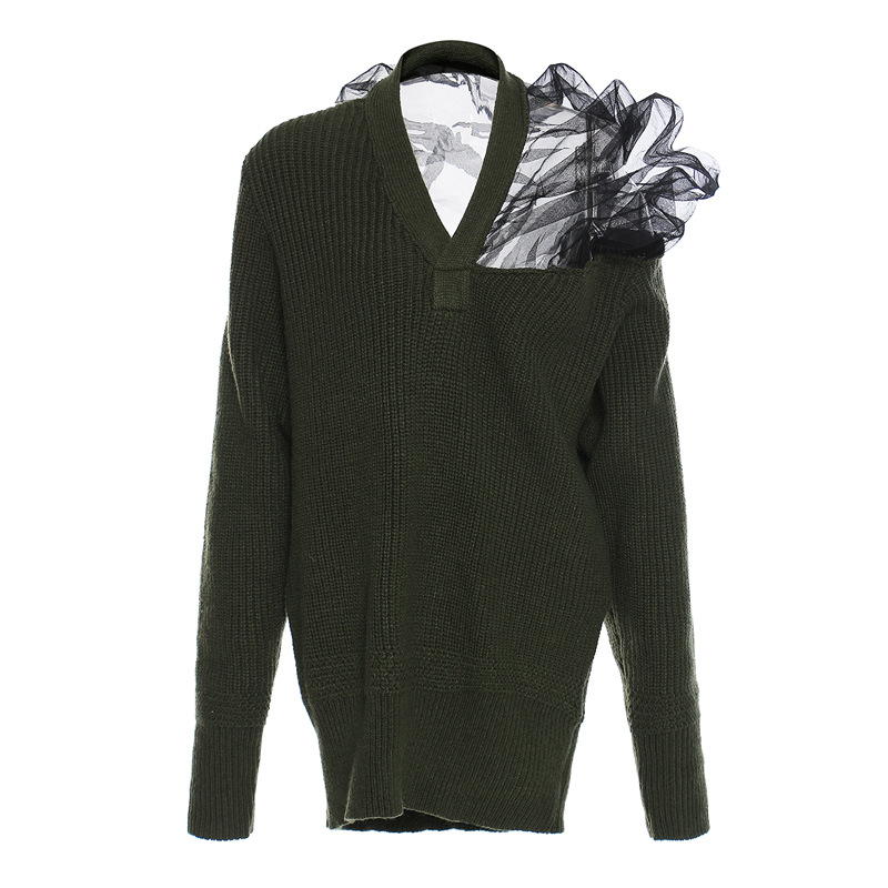25 Autumn And Winter Belgian Personality Autumn And Winter Three-Dimensional Mesh Splicing Large Velvet Wool V Collared Sweater 1410 HZ1208