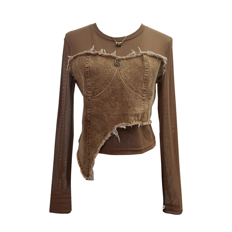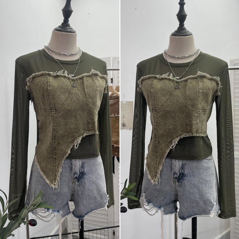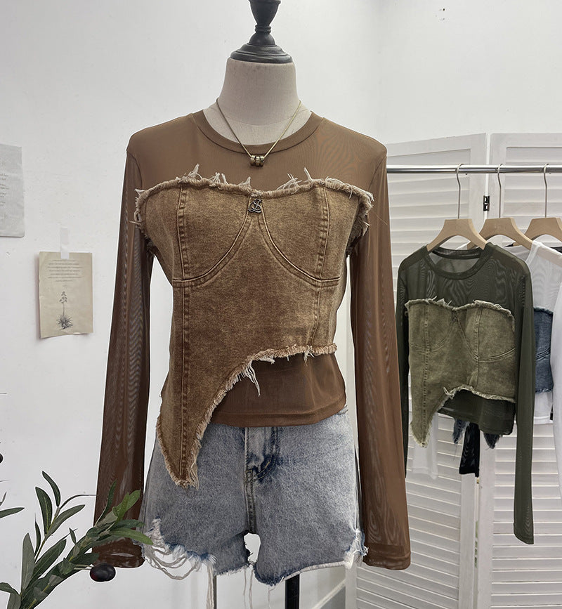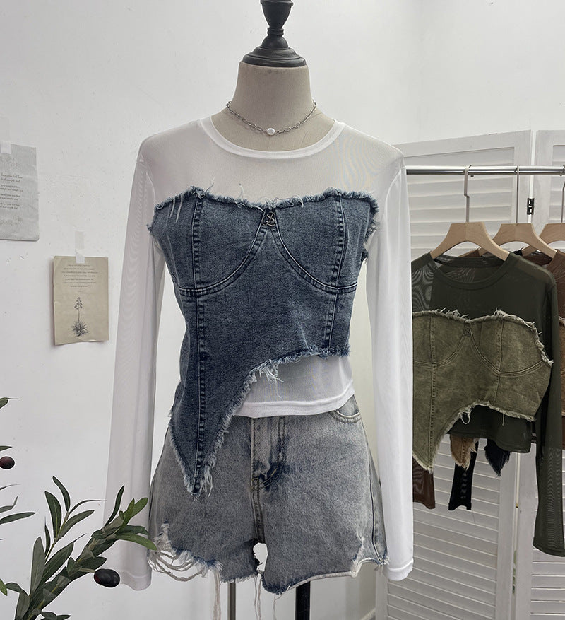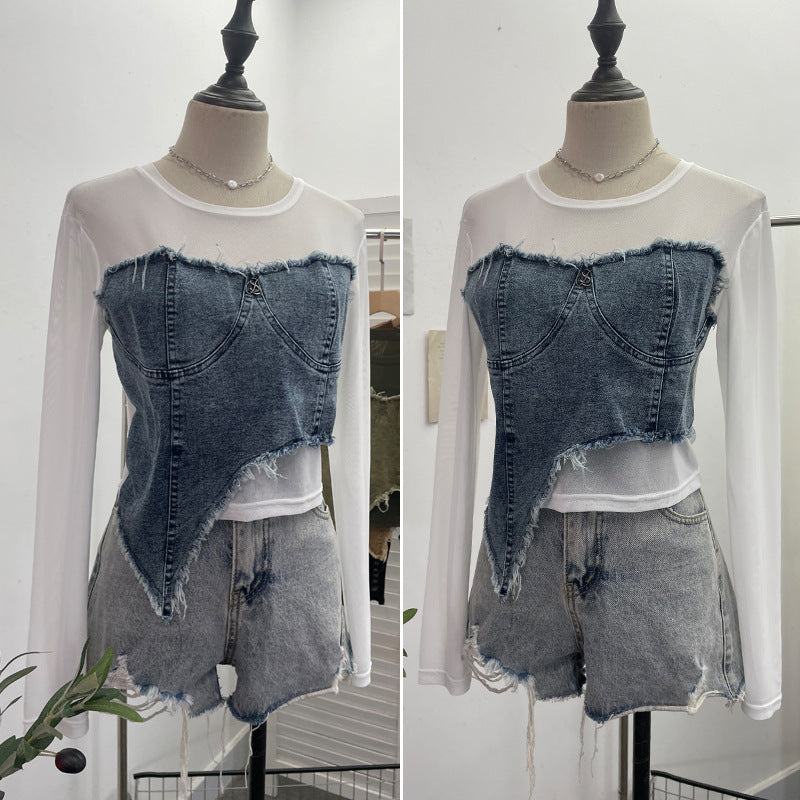 Design Feel Niche Cowboy Splicing Long-Sleeved Mesh T-Shirt Girl Summer Round Collar Dress Short Top 2617 HZ1208