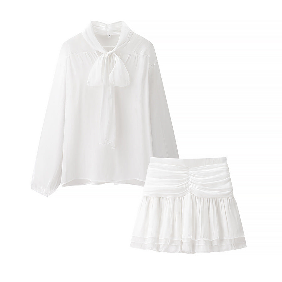 Fashion Women's Two-Piece Summer Thin Bow Tie With Long-Sleeved Cover Loose Shirt Folded Mini Dress HZ1208