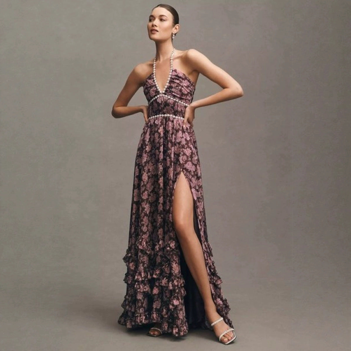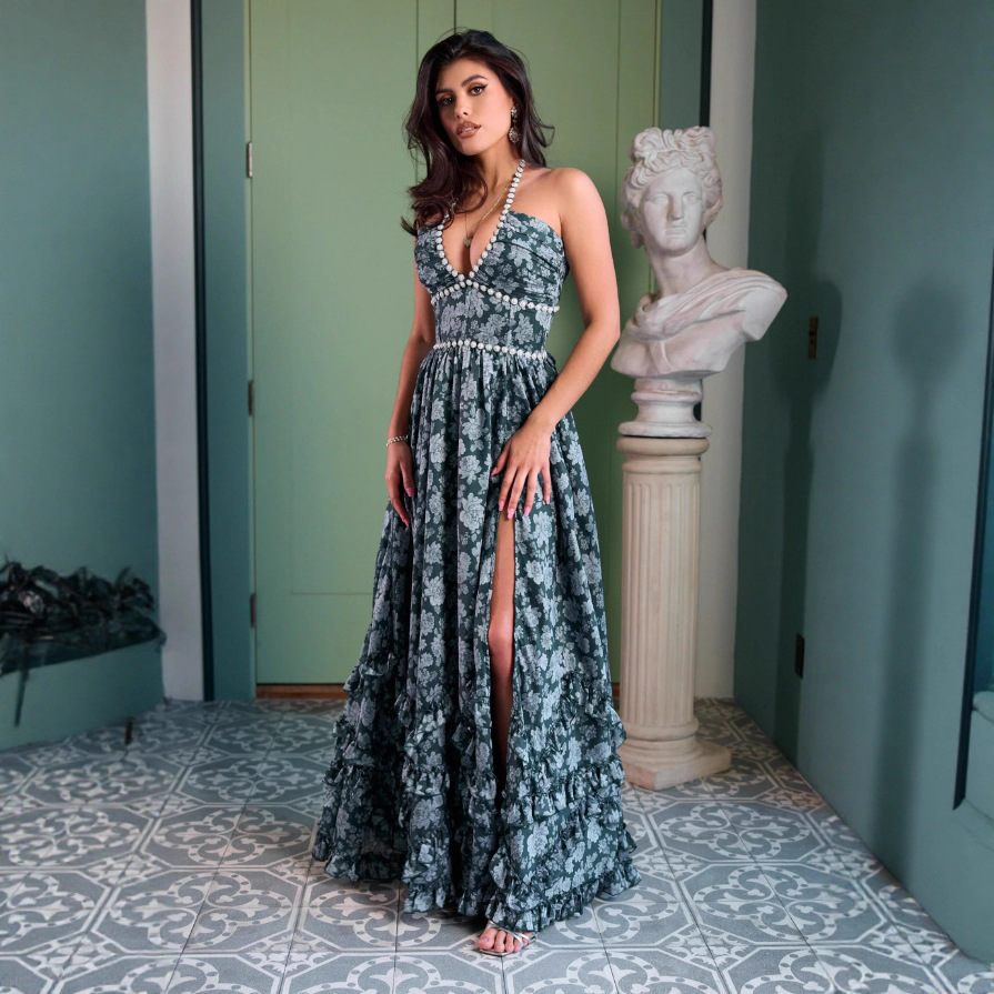 French Sexy Pure-Want Wind Hanging Neck Dress Women's Summer Long Seaside Resort Wind-Dexed Skirt Floral Dress HZ1208