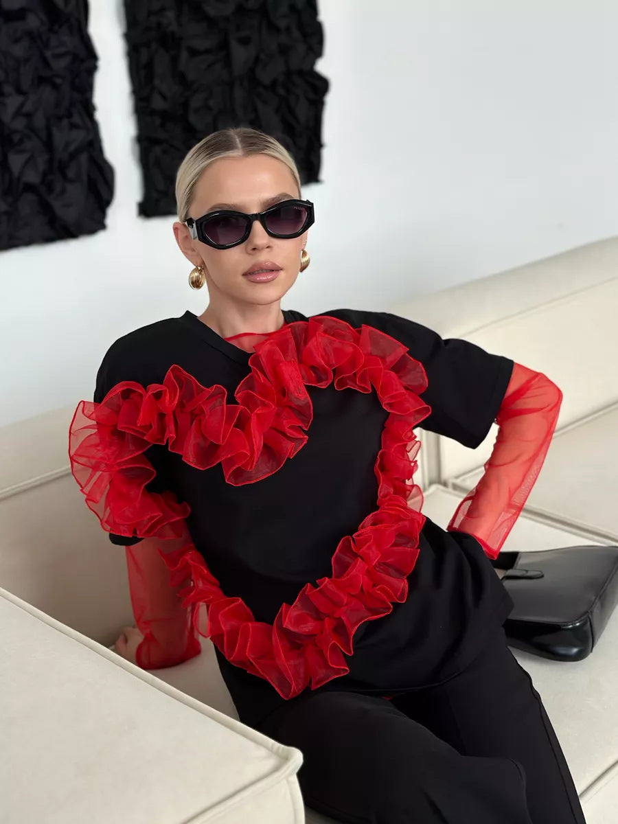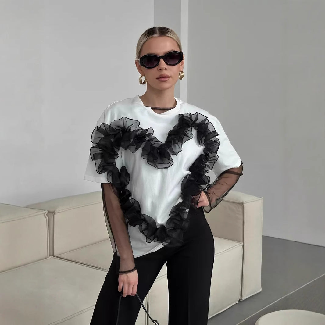 Love Eogen Yarn Folded Spliced T-Shirt Women Fashion In Wind Collar Loose Cotton Top HZ1208