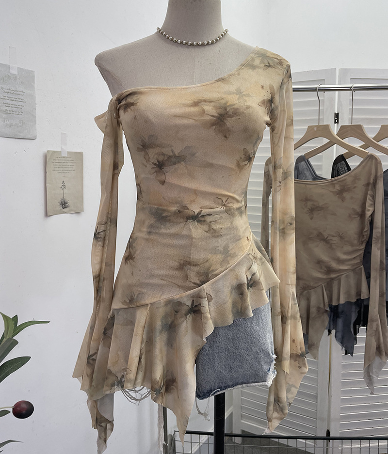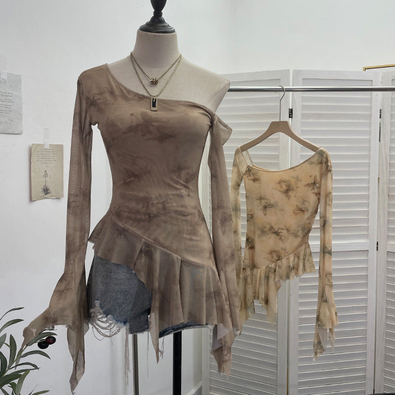 Personality Tie-Dye-Print Oblique Shoulder Dress Repair Irregular Lotus Horn Long-Sleeved Mesh T-Shirt 9955 HZ1208