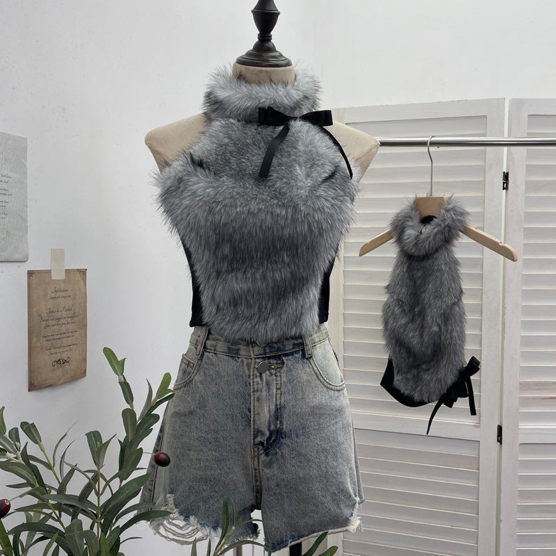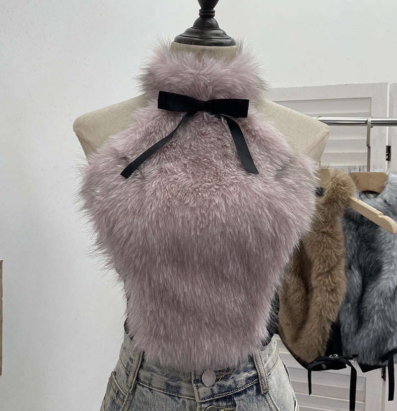 Real-Shot Bow Decorative Hair Splicing Elastic Hanging Neck Vest Outside Wearing Hairy Short Grinding Coat 2791 HZ1208