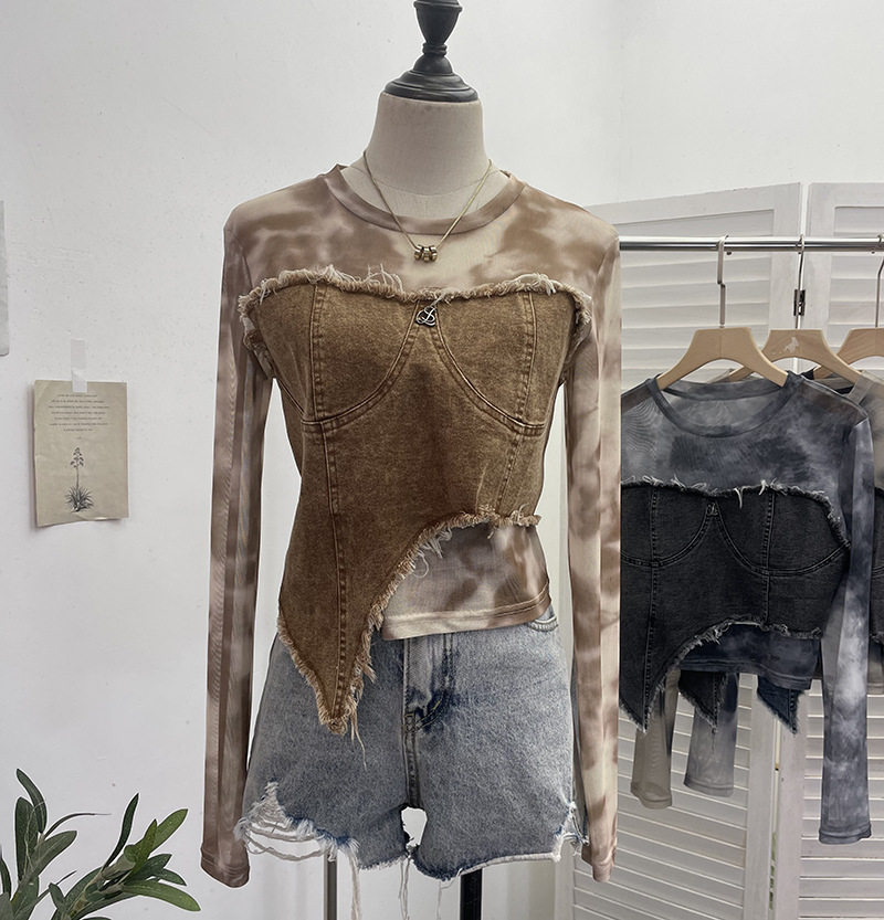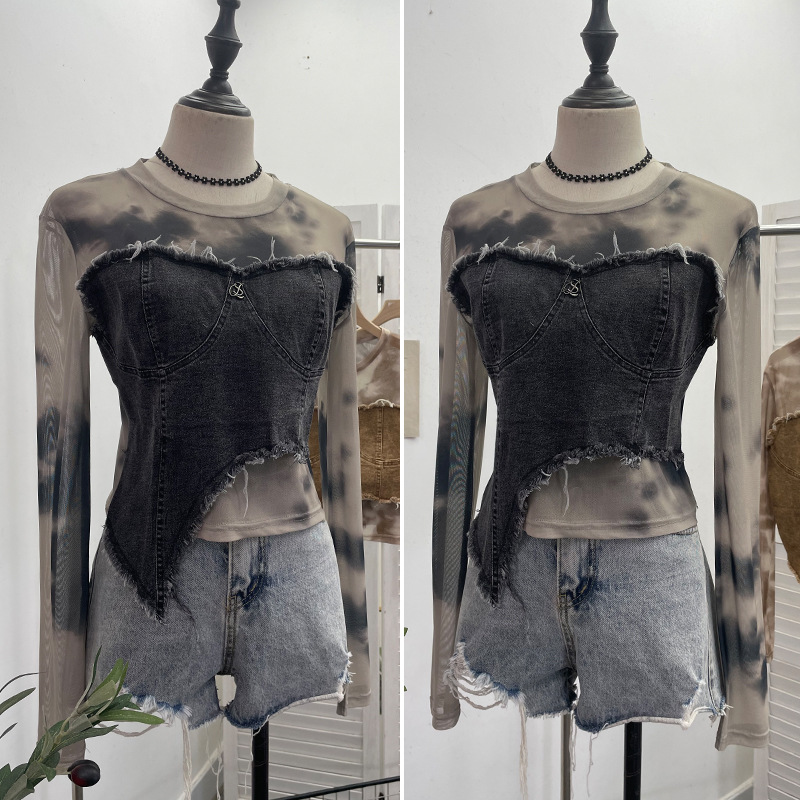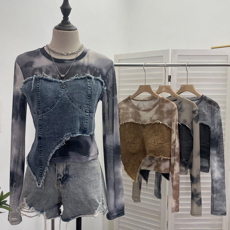 Vintage Dye Mesh Spliced Denim Shoulder Long-Sleeved T-Shirt T-Shirt T-Shirt Dress 2617 HZ1208